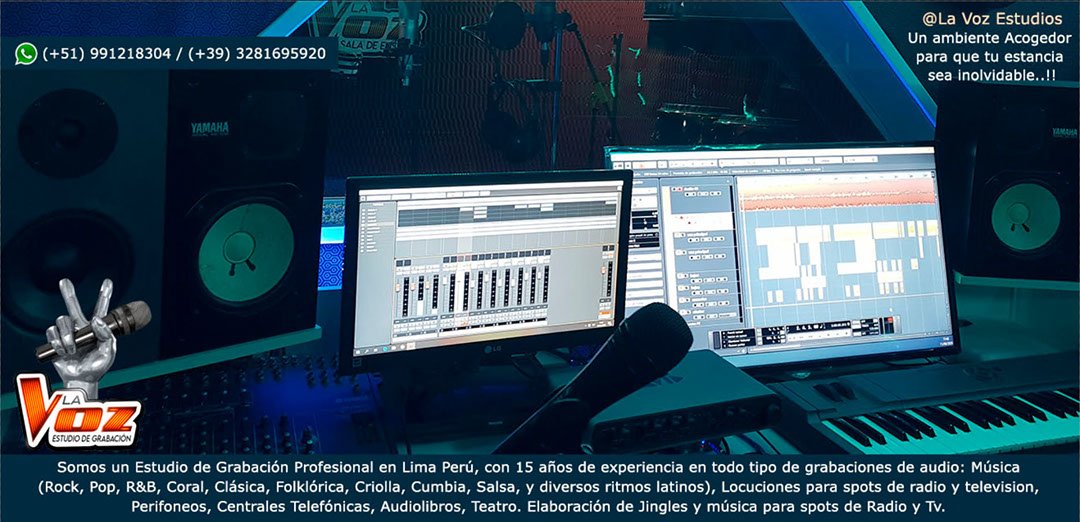 Somos un estudio de grabación profesional en Lima Perú, con 18 años de experiencia en todo tipo de grabaciones de audio: música, Rock, pop, R&B, Clásica, Folclórica, Criolla, Cumbia, Salsa y diversos ritmos latinos; Locuciones para spot’s de radio y televisión perifoneo, centrales telefónicas, audiolibros, teatro. Elaboración de Jingles y música para spots de Radio -Tv y Políticos.